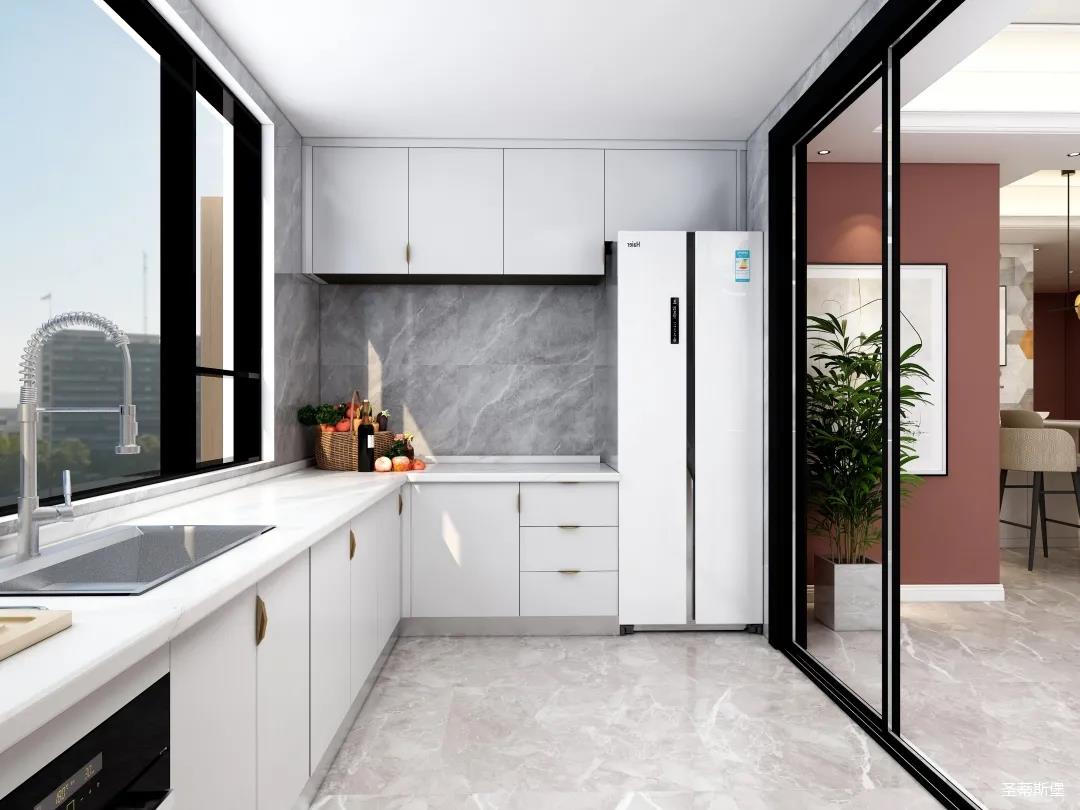 厨房是南北通透的U型空间布局,功能齐全且合理衔接,纯白的柜体让视野更开阔,用透明玻璃门隔断,极大的提升了生活的品质。